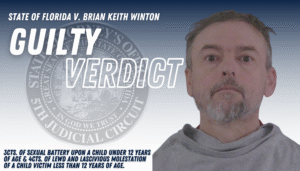 (Sumter County, FL) In the courtroom of Judge Mary P. Hatcher, jurors found 48-year-old Brian Keith Winton, of Bushnell, guilty on all counts. Winton was taken into custody to await his sentencing pending a presentence investigation. Winton was charged and convicted of three counts of Sexual Battery upon a Child
