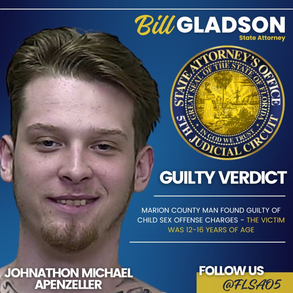 (Marion County, FL) Yesterday, a jury found 28-year-old Johnathon Michael Apenzeller guilty of three felony counts of Lewd and Lascivious Battery and one felony count of Possession of Child Pornography.
